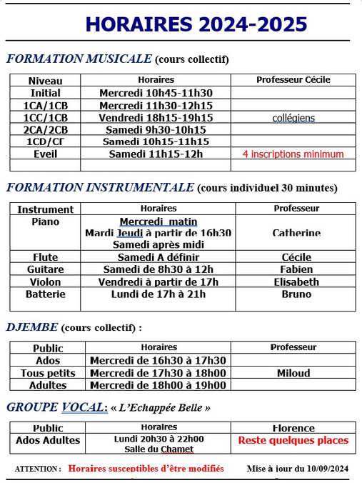 Pour les formations en instrument, djembé ou groupe vocal, les inscriptions peuvent se faire toute l'année s'il reste des places